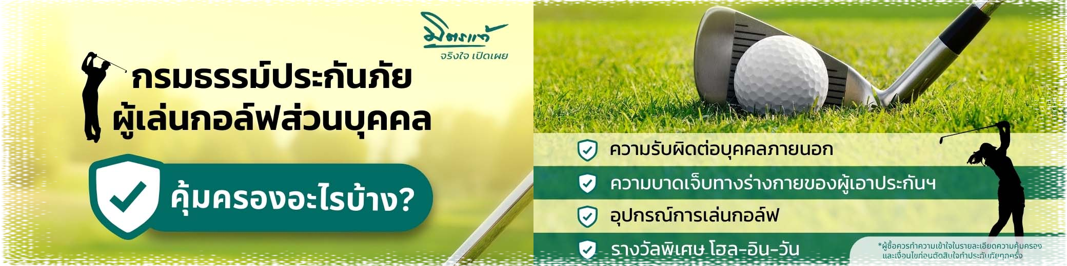 1. ความรับผิดต่อบุคคลภายนอก 1.1 การบาดเจ็บ หรือสูญเสียชีวิต ยกเว้นบุคคลในครองครัวที่อยู่ด้วยกัน กับผู้เอาประกันภัย 1.2 ความสูญเสียหรือความเสียหายต่อทรัพย์สิน ยกเว้นทรัพย์สินที่ผู้เอาประกันภัย หรือบุคคลในครอบครัวที่อยู่ด้วยกัน กับผู้เอาประกันภัยเป็นเจ้าของหรือครอบครอง หรือ อยู่ในความดูแลหรือควบคุมหรือกำลังใช้ 2. อุบัติเหตุของผู้เอาประกันภัย ในขณะที่ หรือสืบเนื่องจากการฝึกหัด การซ้อมหรือการเล่นกอล์ฟในสนามกอล์ฟ หรือสนามฝึกหัดกอล์ฟสาธารณะ 2.1 การเสียชีวิต การสูญเสียอวัยวะ (แขน ขา หรือสายตา) ทุพพลภาพถาวรสิ้นเชิง 2.2 ค่ารักษาพยาบาล 2.3 ทุพพลภาพชั่วคราวสิ้นเชิงไม่เกิน 52 สัปดาห์ 2.4 ทุพพลภาพชั่วคราวบางส่วนไม่เกิน 52 สัปดาห์ 3. อุปกรณ์การเล่นกอล์ฟ (เฉพาะไม้กอล์ฟหรือรถลากถุงกอล์ฟ) 3.1 ในขณะที่ หรือสืบเนื่องจากการฝึกหัดซ้อม หรือการเล่นกอล์ฟสาธารณะ 3.2 ในขณะที่เดินทางไป-กลับ ระหว่างที่พักของ ผู้เอาประกันภัยกับสนามกอล์ฟ หรือสนามฝึกหัดกอล์ฟสาธารณะ 4. โบนัสพิเศษ โฮล-อิน-วัน (จ่ายครั้งเดียวต่อปี) 4.1 การแข่งขันเป็นทางการมีหลักฐาน ลงลายมือชื่อรับรองโดยผู้แข่งขัน ผู้จัดการสนาม และผู้จัดการแข่งขัน 4.2 นอกเหนือจากข้อ 4.1 ลงลายมือชื่อรับรองโดยผู้จัดการสนาม |